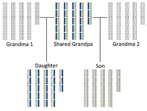 In this case, the son got only green chromosomes and the daughter got only blue chromosomes from grandpa. Now they aren’t genetically related at all!
