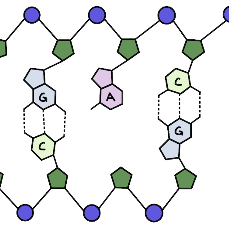 Let’s zoom in: what makes up each strand of our DNA? The outside is made up of alternating phosphate and sugar groups that form the backbone. On the inside of the helix you'll find the base pairs that make up the information in our DNA (those A’s, T’s, C’s, and G’s!).